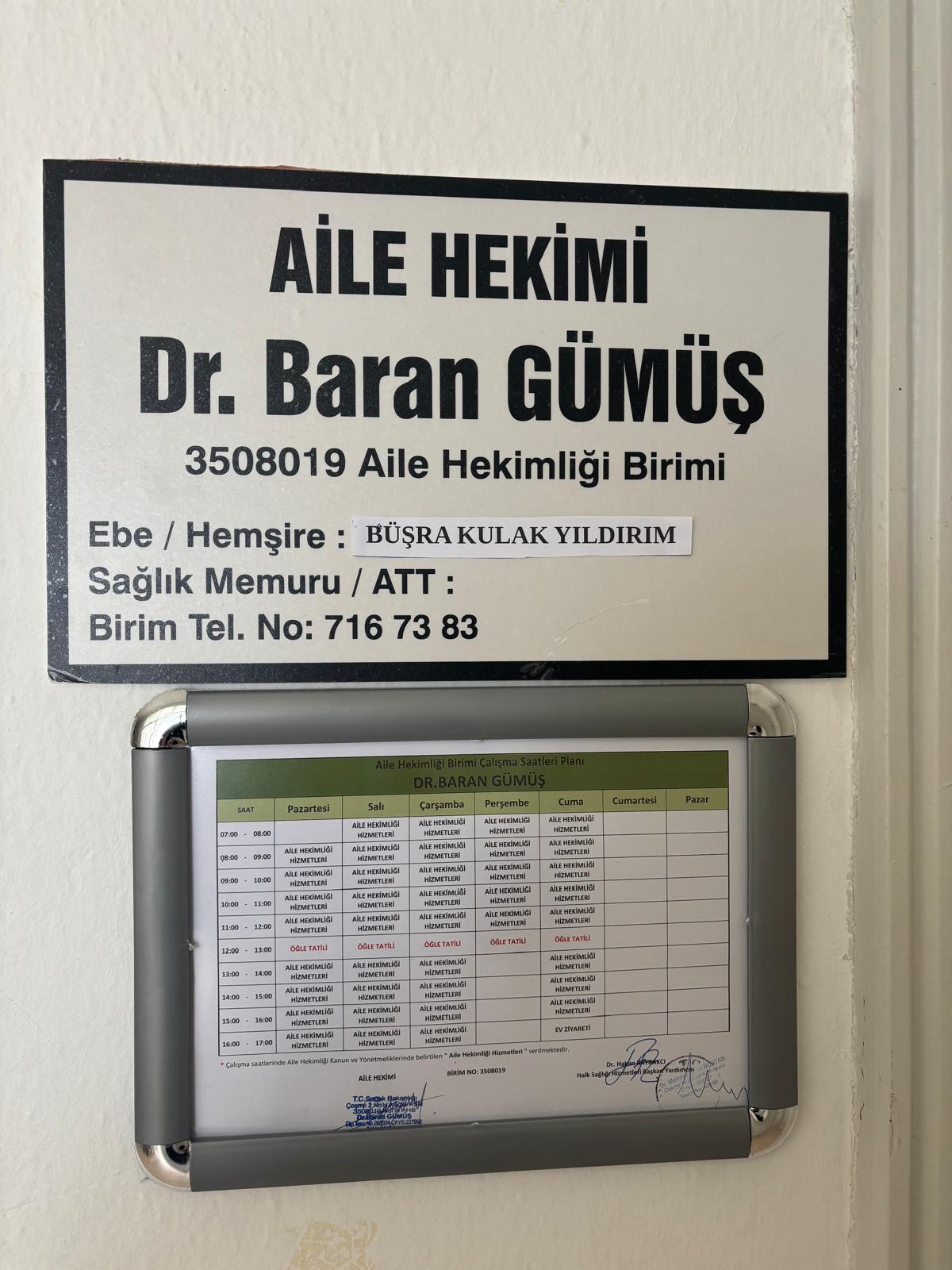 DR.Baran GÜMÜŞ / Hemşire Büşra Kulak YILDIRIM 3508019 nolu Aile Hekimiği Birimi